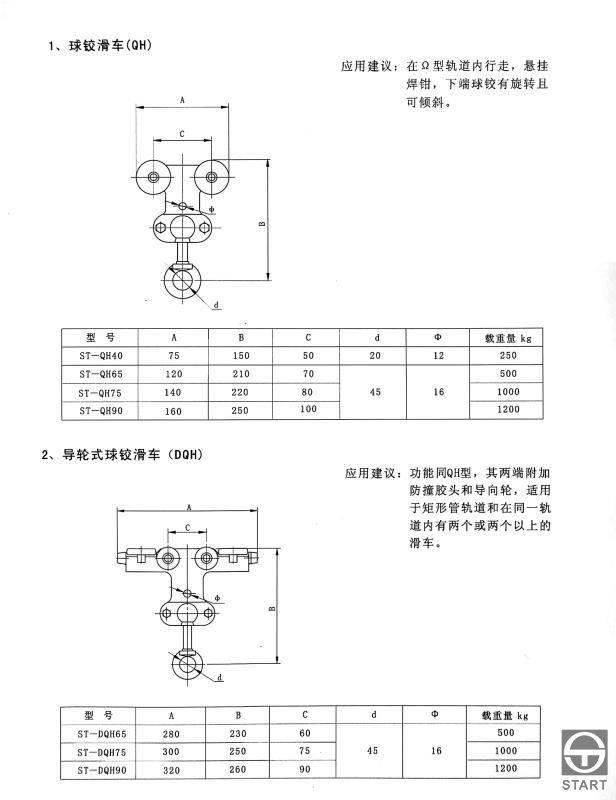 注:以下产品型号以“ST——①字母 ②数字”替代,ST表示本公司产品代号,①字母表示轨道、滑车及配件名称,②数字表示轨道外形宽度或滑车、轨道配件与轨道型号的相配。